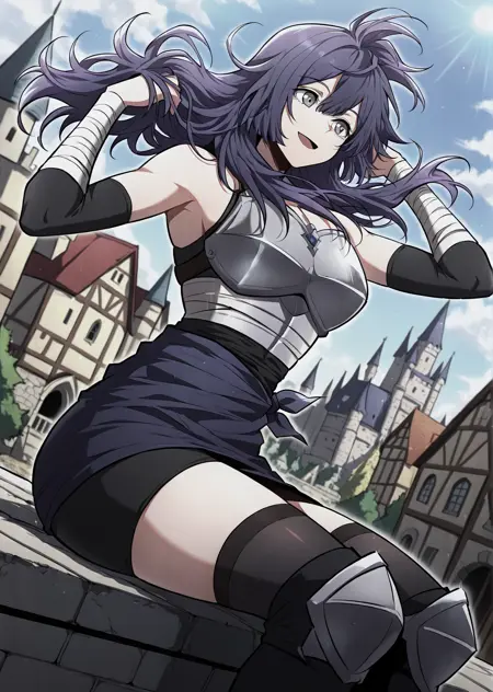 black sleeveless top, armor chestplate, tied waist cloth, short skirt wrap, thigh-high black stockings, armored knees, athletic build