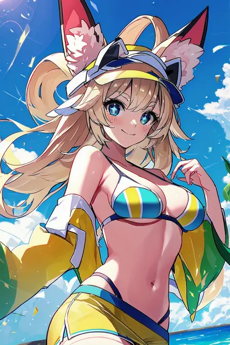 blue bikini, bikini skirt, yellow skirt, visor