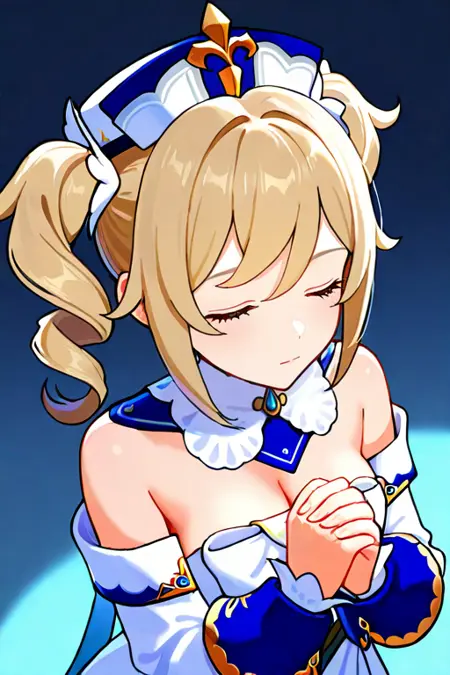 1girl, solo, barbara_(genshin_impact), twintails, drills hair, blonde hair, white headwear, blue eyes,