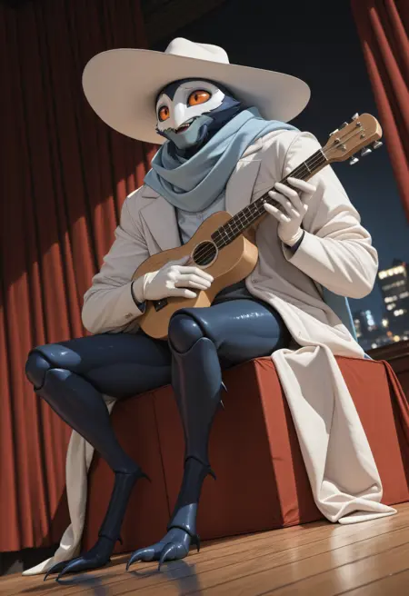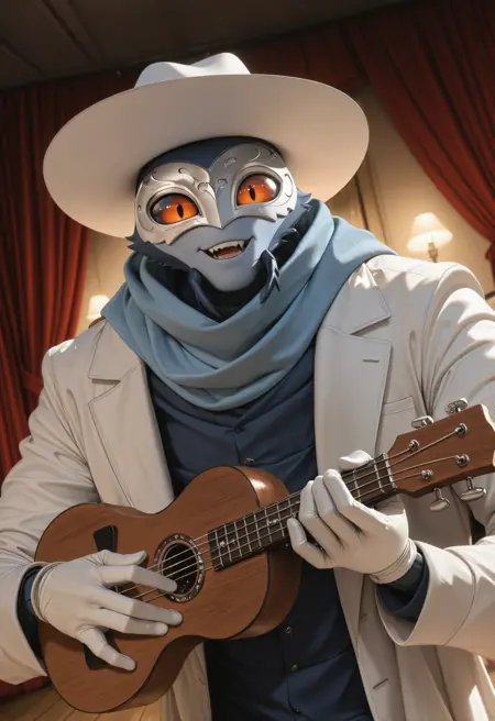 white formal suit, long tailcoat, wide-brimmed white hat, teal scarf, white gloves, green shirt collar, dark dress shoes, white pants, white masquerade mask