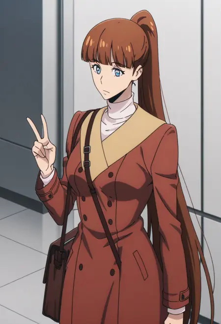 Trigger = zzleejooheezz, Tags = 1girl, brown hair, long hair, solo, blue eyes, bangs, turtleneck, ponytail, anime coloring, uniform, coat, pants, shirt, blunt bangs, bag, very long hair,