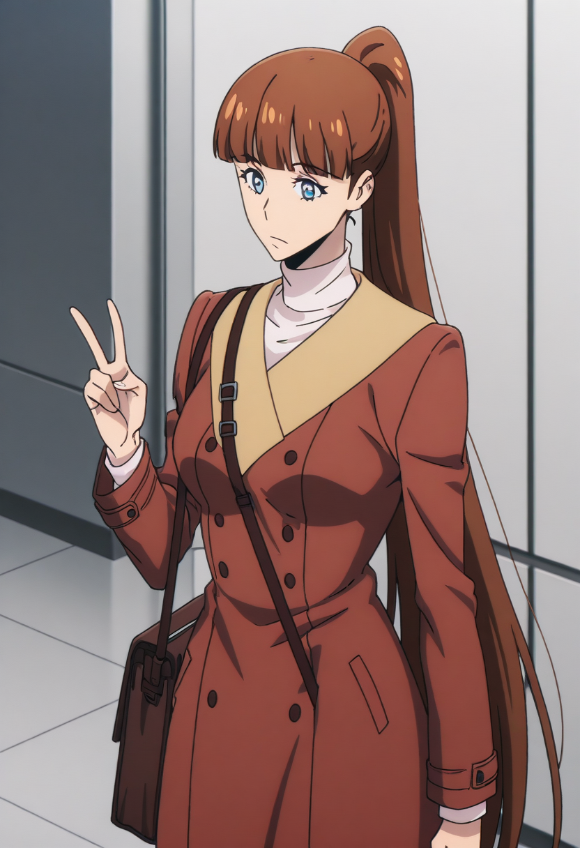 触发词 = zzleejooheezz,标签 = 1girl, brown hair, long hair, solo, blue eyes, bangs, turtleneck, ponytail, anime coloring, uniform, coat, pants, shirt, blunt bangs, bag, very long hair,