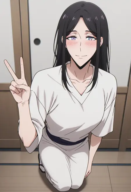 触发词 = zzkyungzz,标签 = 单人,黑发,长发,1女孩,微笑,紫眼,上衣,锁骨,白衬衫,日式服装,齐刘海,蓝眼