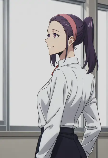 触发词 = zzsungjinahzz,标签 = 1girl, solo, ponytail, purple hair, purple eyes, shirt, smile, long hair, white shirt, skirt, collared shirt, long sleeves, black skirt, black hair, school uniform, hairband,