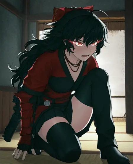 服饰: D3fF1t,盔甲,黑色过膝长筒袜,宽版过膝长筒袜,露指手套,黑色短裙,绝对领域,首饰,项链,红色发带发结,和服,黑色鞋履