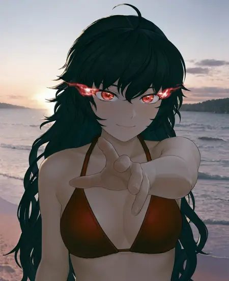 外观: R4v3nBr4nw3n,1个女孩,黑发,长发,呆毛,红眼