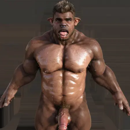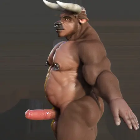 minoorc, realistic, nipples, chest hair, short hair, nose ring, male pubic hair, navel hair, facial hair, hairy, pubic hair,cow boy, cow horns, cow ears,furry