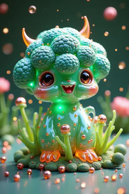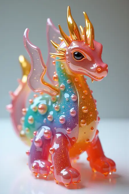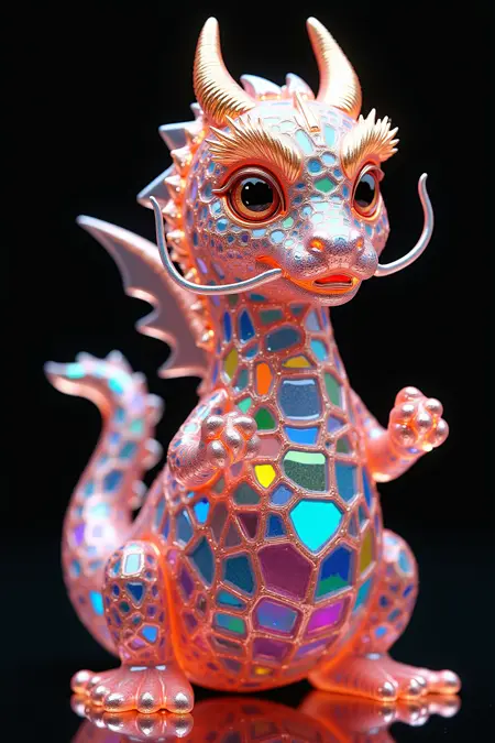 권장 프롬프트 문구 형식: 트리거 단어 + 주요 설명 + 객체의 본체는 색유리로 만들어졌으며 약간의 로즈 골드로 장식되어 있습니다. 전체 질감은 매끄럽고 투명하며, 색상은 밝고 다채롭습니다.