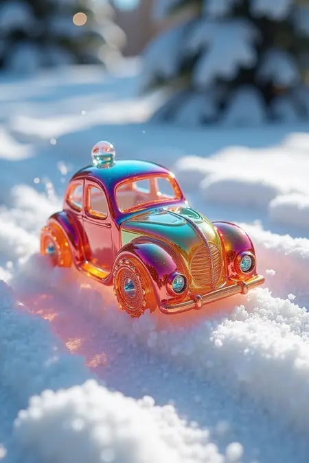샘플 프롬프트 문구: QCBL, 눈 속을 달리는 장난감 자동차. 객체의 본체는 색유리로 만들어졌으며 약간의 로즈 골드로 장식되어 있습니다. 전체 질감은 매끄럽고 투명하며, 색상은 밝고 다채롭습니다.