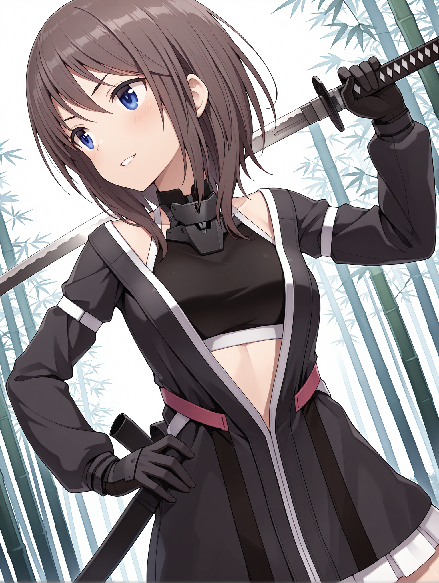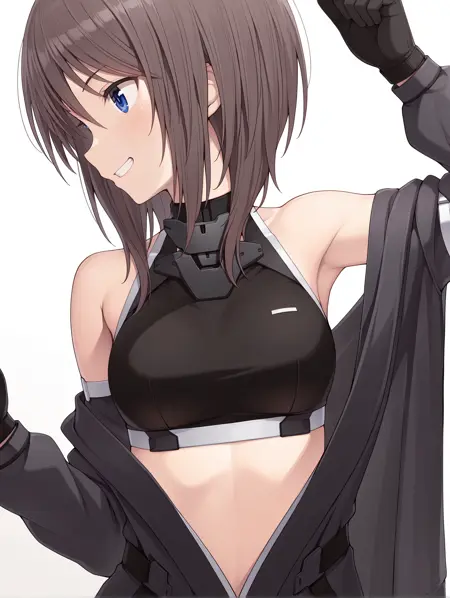 服装(黑smith):Blacksmith_y,long_sleeves,open jacket,black gloves,black turtleneck,black sports bra,black gloves,zettai ryouiki,black_thighhighs