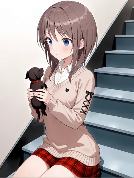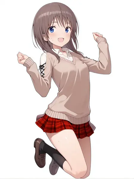 服装(芦高校服):ashihara_h,brown v-neck sweater,white collared shirt,cross-laced clothes,red plaid skirt,black socks,brown loafers