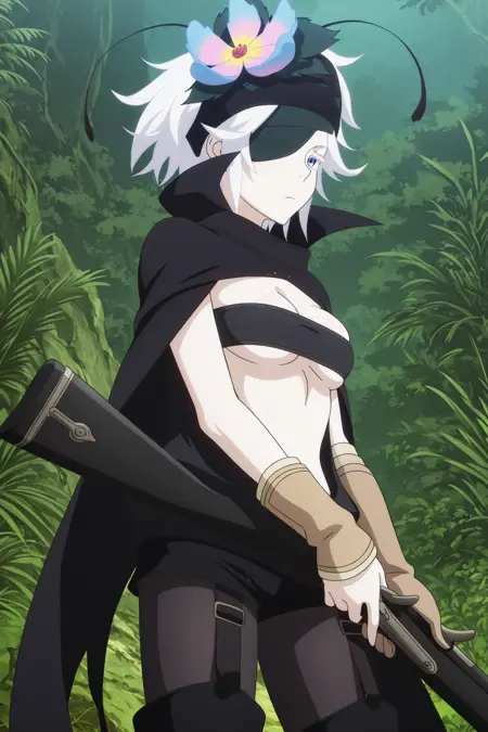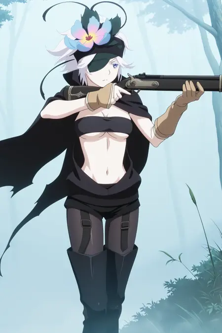 fremy speeddraw, short hair, white hair, headband, hair flower, hairband, eyepatch, white eyelashes, blue eyes, cape, tube top, black shirt, sleeveless, clothing cutout, single elbow glove, single arm warmer, black shorts, black pantyhose, fanny pack, black footwear, thigh boots, knee pads, garter straps