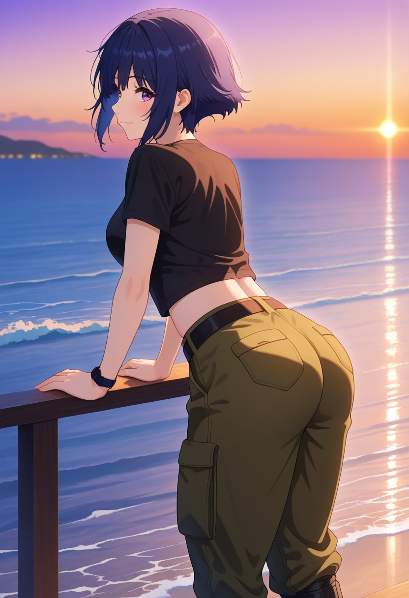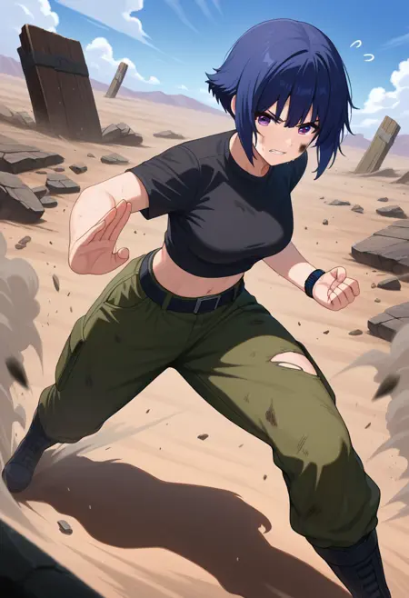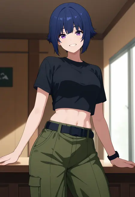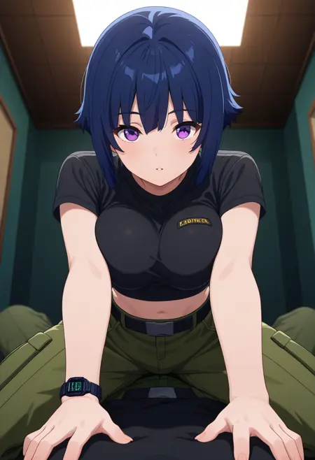 military uniform, crop top, black shirt, short sleeves, wristwatch, midriff, navel, belt, green pants, black boots,