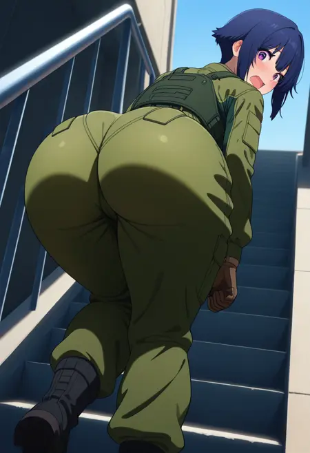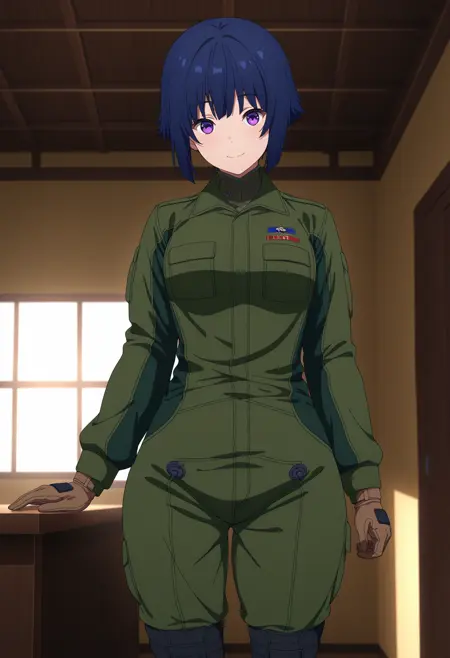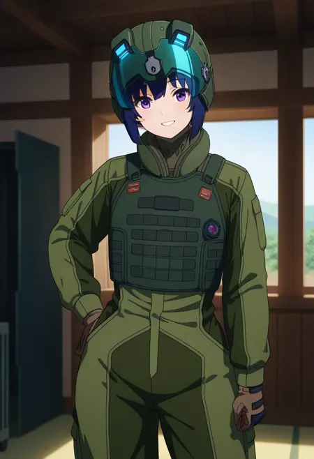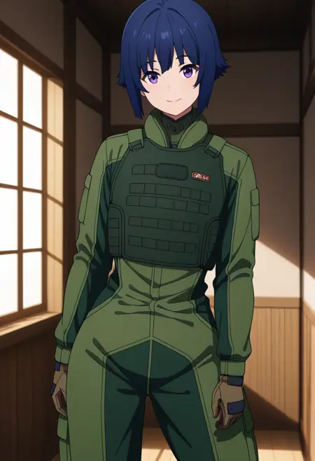 military uniform, green body armor, green jumpsuit, brown gloves, black boots,
