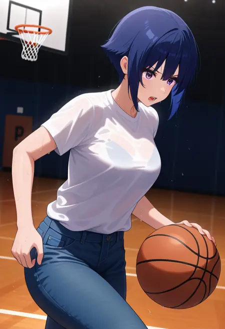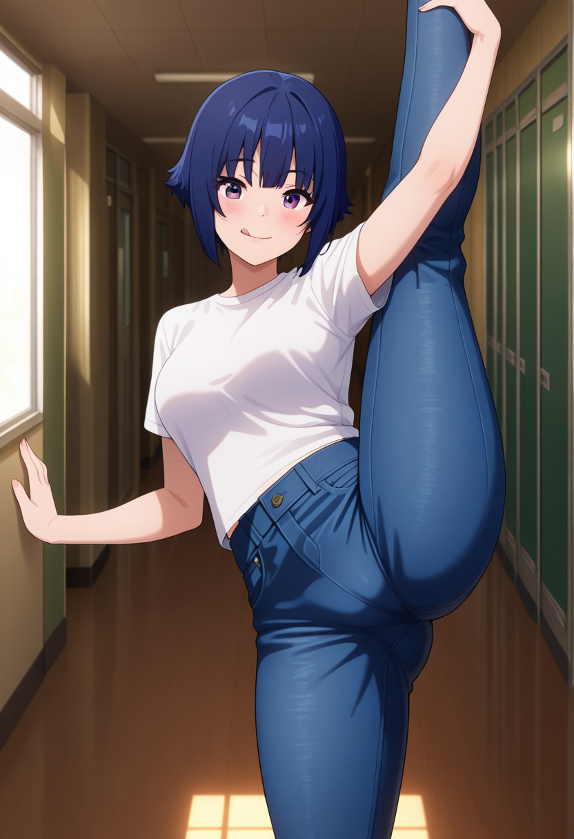 - hibikiww, purple eyes, blue hair, short hair, bangs,