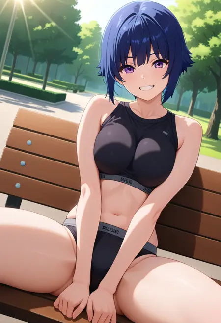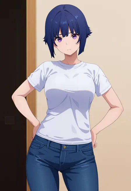 The neckline pattern of the "jumpsuit" often doesn't render properly unless the image is upscaled using Highres fix or a similar method.