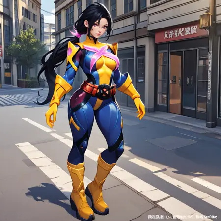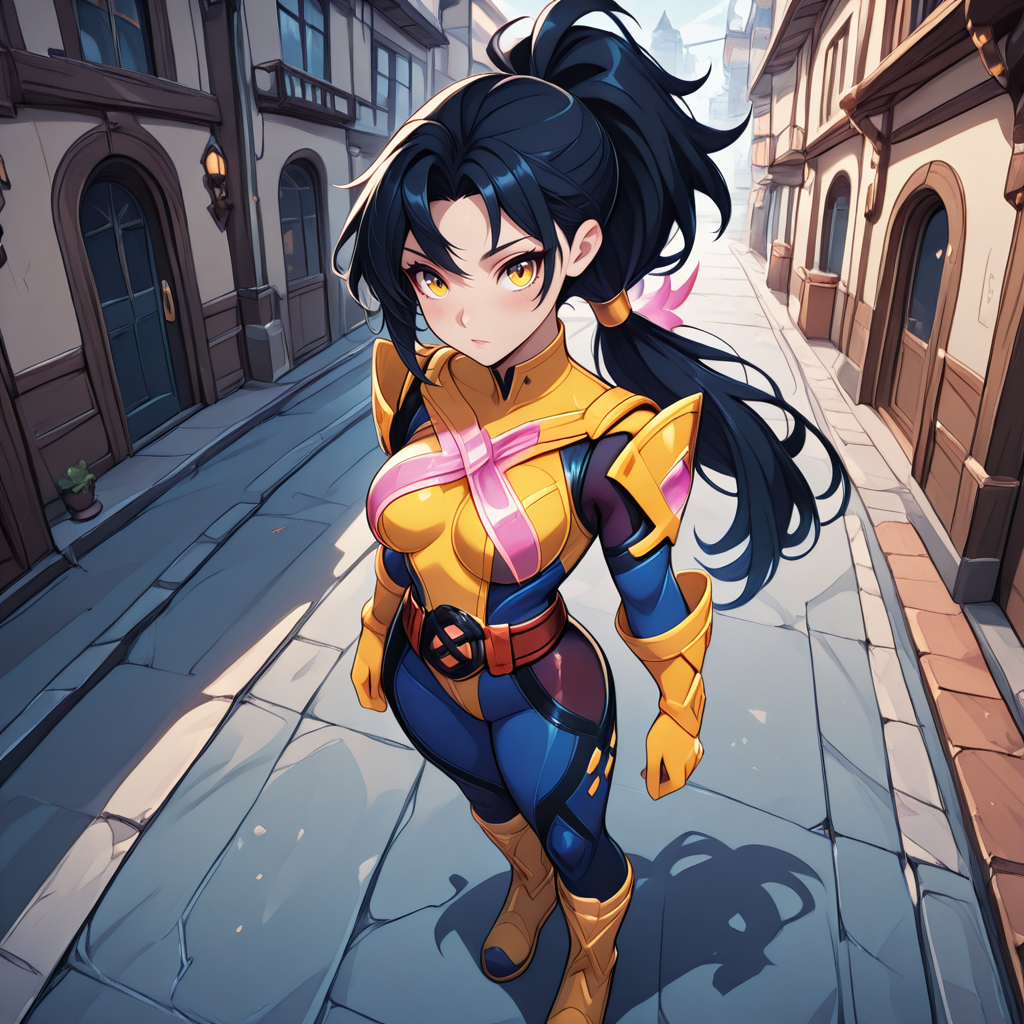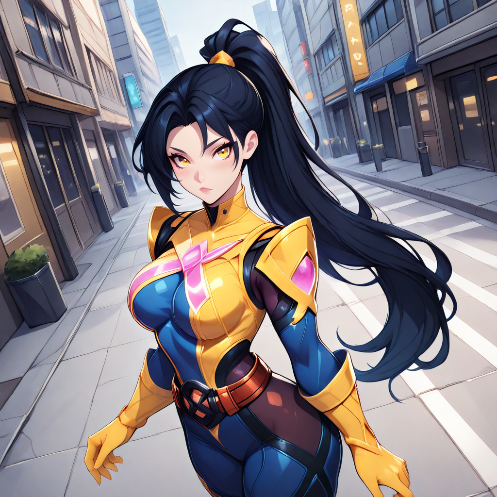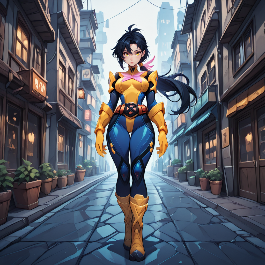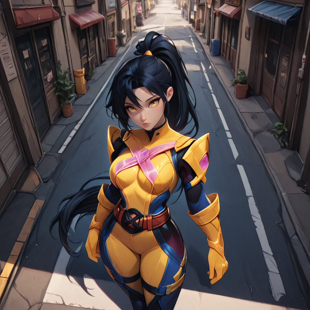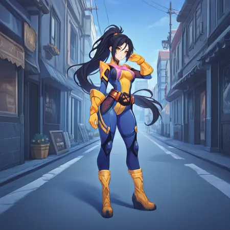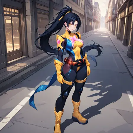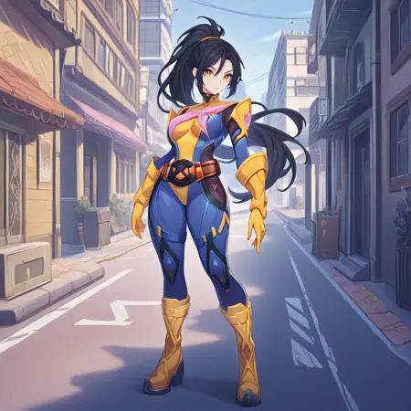 PSYL0CK3RX, solo, 黑色头发, 连体衣, 1girl, 黄色手套, 长发, 腰带, 马尾辫, 蓝黄搭配服装, 手套, 黄色靴子,