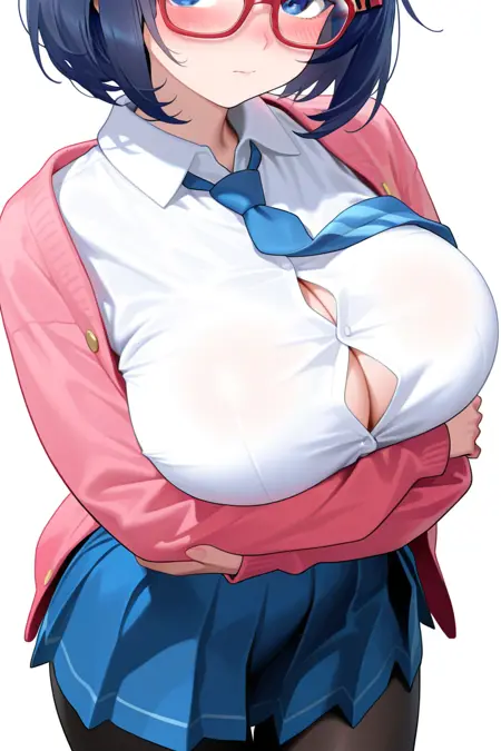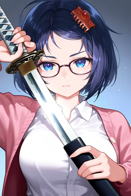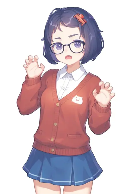 mila \(miside\), 1girl, solo, necktie, glasses, ahoge, blue necktie, hair ornament, short hair, shirt, white shirt, collared shirt, ahoge, black-framed eyewear, cardigan, hairclip, long sleeves
