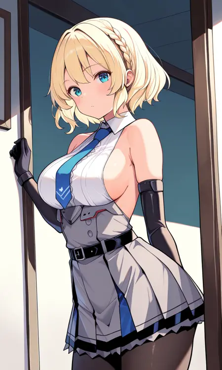 デフォルトの衣装: coloradoKC、ショートヘア、帽子、白シャツ、編み髪、ノースリーブ、黒手袋、肘まである手袋、黒タイツ、サイドブーブ、カプセル、ヘッドギア、青いネクタイ、プリーツスカート、グレーのドレス、ガーリソン帽、グレーの頭部装備、サイド編み髪