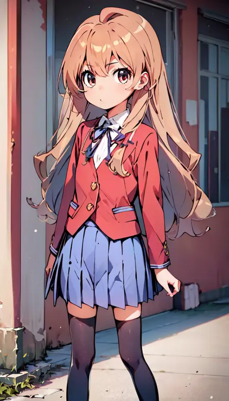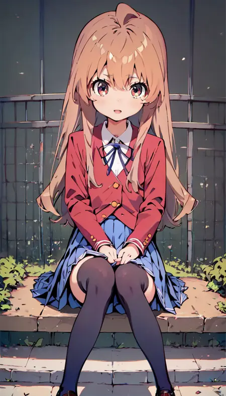 prompt: aisaka taiga, 1girl, solo, skirt, long hair, blue skirt, school uniform, pleated skirt, black ribbon