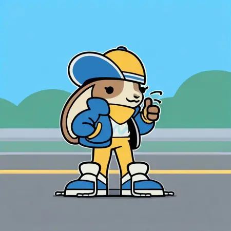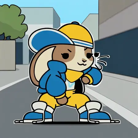 peeb,lagomorph,furry female,short stack,two tone body,brown body,rabbit ears,ears down,dot eyes,black eyes,whiskers,yellow headwear,yellow scarf,blue jacket,white shirt,yellow pants,blue footwear