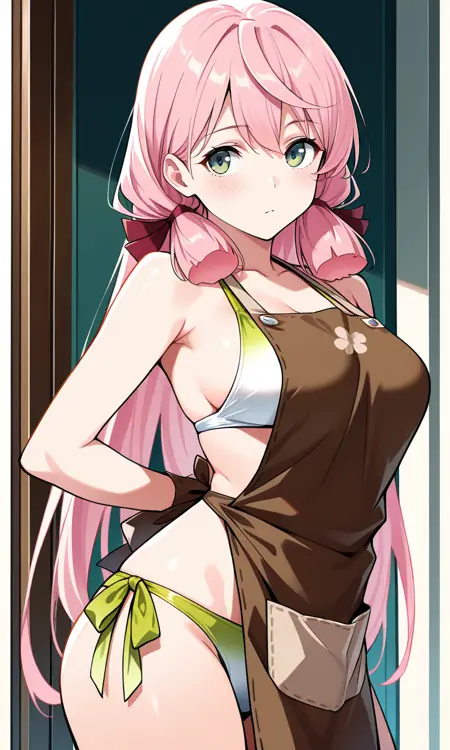 夏の服装: akashisummerKC、長い髪、緑の目、ピンクの髪、髪のリボン、ビキニ、サイドタイのビキニ下着、白いビキニ、緑のビキニ、トリスリボン、ほぼ裸のエプロン、茶色のエプロン