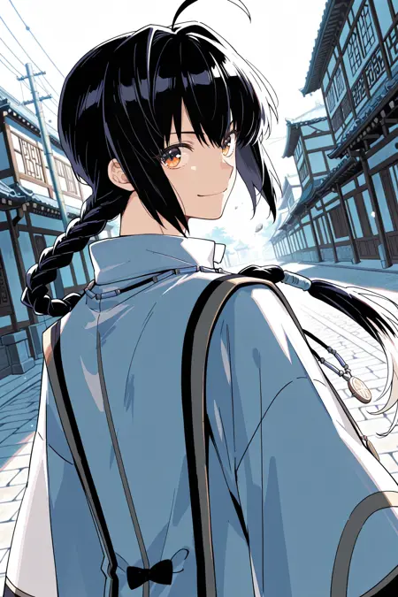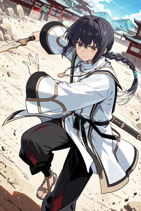 takeru, yamato takeru, 긴 머리, 검은 머리, 단일 땋은 머리, 옆머리, 이색 눈, 검은 눈, 주황색 눈, ahoge, 앞머리, 땋은 포니테일, 낮은 포니테일