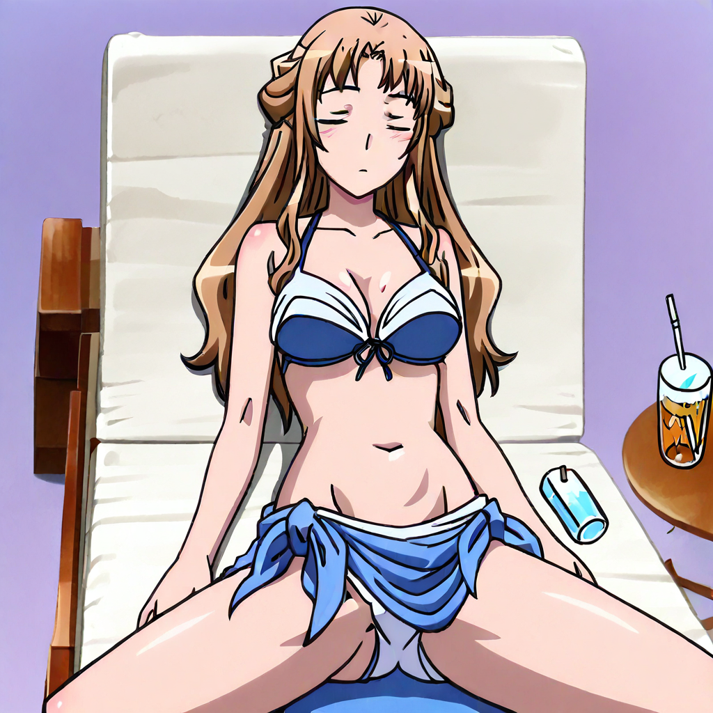 キャラクターsource_anime, ellen ernea ortlinde, long hair, brown hair, large breasts, purple eyes, very long hair, mature female, blue bikini, navel, pov, looking at viewer, ellen_sarong, beach_background, cowboy shot, tucking hair, smilesource_anime, yuel ernea belfast, long hair, blonde hair, large breasts, ponytail, closed eyes, very long hair, half updo, mature female, yuel_earrings, yuel_bikini, navel, from above, yuel_sarong, lying on lounge_chair, full of body, table, drink, shadow, smile