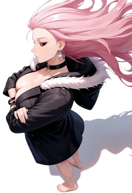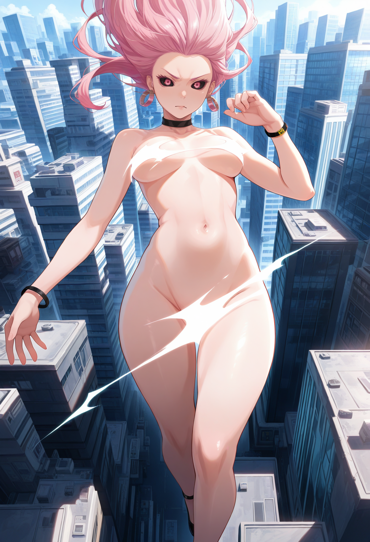 uro, 1girl, 긴 머리, 귀걸이, 검은 공막, 목걸이, 팔찌, 분홍색 머리, 분홍색 눈, 투명한 센서링