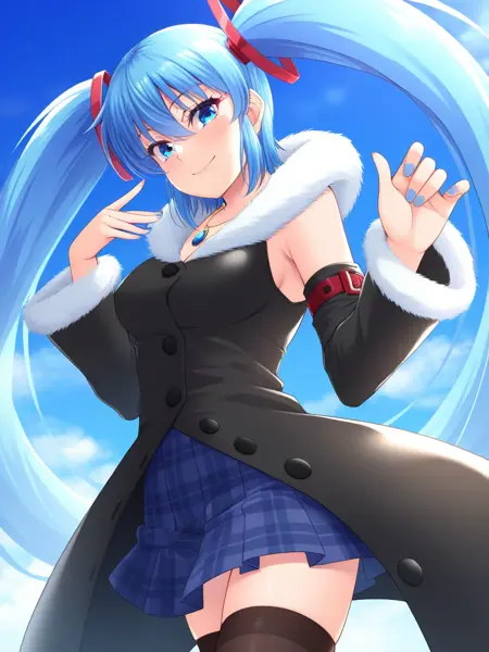 high heels, nail polish, pleated skirt, blue skirt, plaid skirt, fur-trimmed sleeves, fur-trimmed coat,