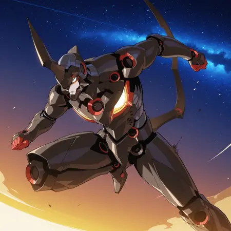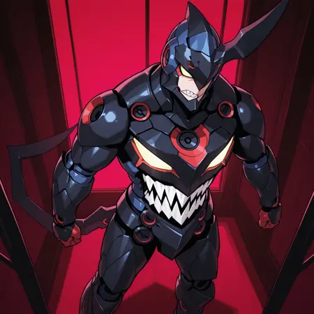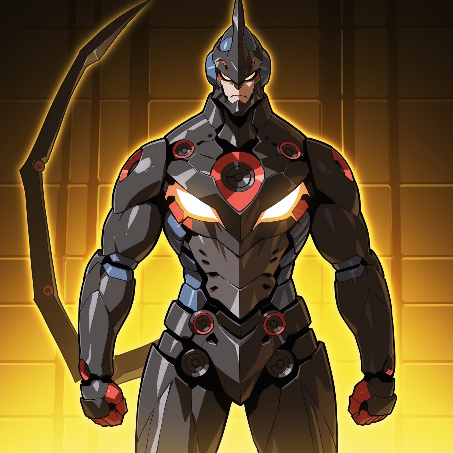 Tags to use: mecha, mechanical tail, humanoid, single horn, black armor, multicolored armor, helmet, tall, yellow eyes, no pupils