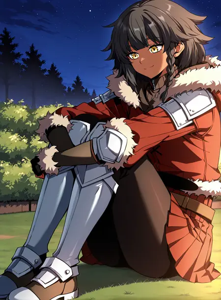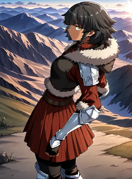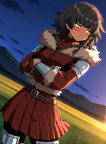 Mica_Earthborn_winter, red winter outfit, fur-trimmed coat, brown fur accents, high collar, long sleeves, leather belt, armored boots, arm guards, pleated skirt, layered outfit