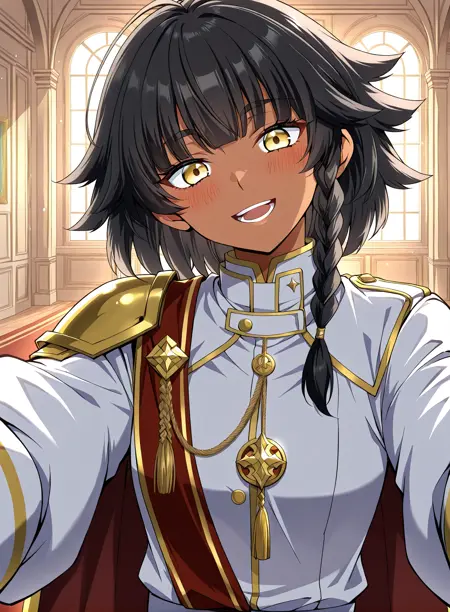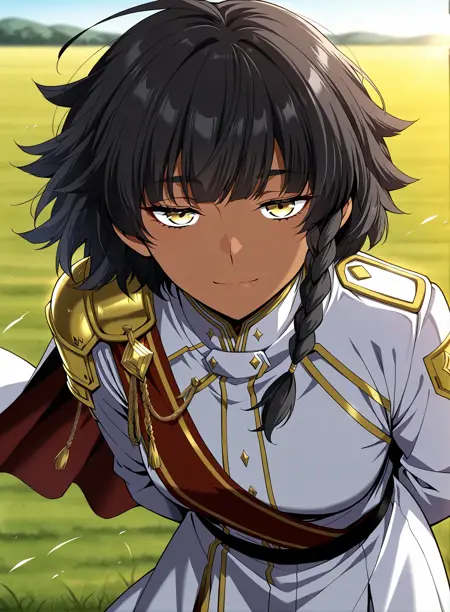 1 girl, solo, dark skin, golden eyes, short black hair, uneven bangs, side braid, layered hair, messy hairstyle