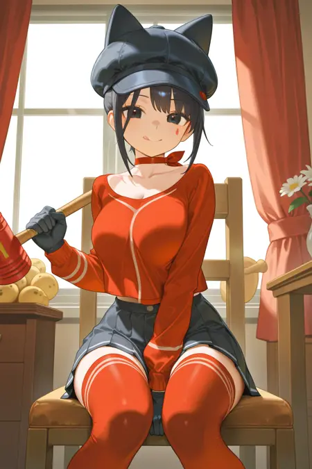 cool mita \(miside\), 1girl, facial mark, hat, solo, blue headwear, skirt, thighhighs, gloves, navel, blue skirt, crop top, midriff, striped clothes, long sleeves, red thighhighs, red shirt, choker, pleated skirt, red choker, striped thighhighs, short hair, miniskirt, shirt,