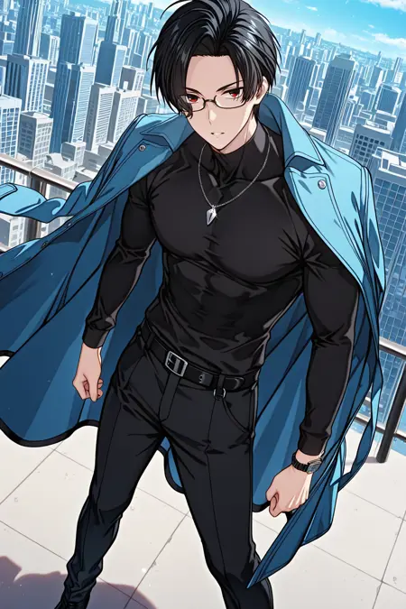 검은 셔츠, 긴 소매, 시계, 안경, 검은 벨트, 검은 바지, 어깨에 두른 코트, 파란 코트, 목걸이, 검은 신발