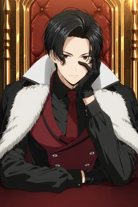 정장, 빨간 넥타이, 털 장식이 있는 코트, 빨간 조끼, 칼라 셔츠, 검은 셔츠, 검은 장갑, 검은 바지, 높은 칼라, 갈색 신발