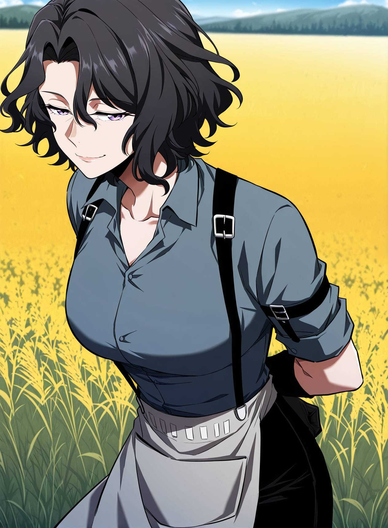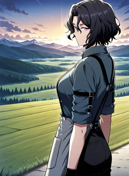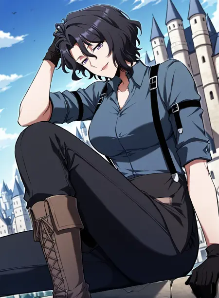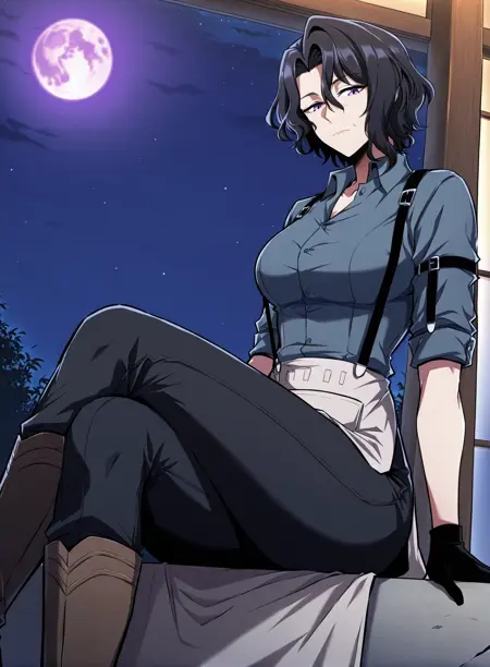 Madam_Astera, 1 girl, solo, purple eyes, mature woman, black hair, short hair, loose waves, side part, strand over face
