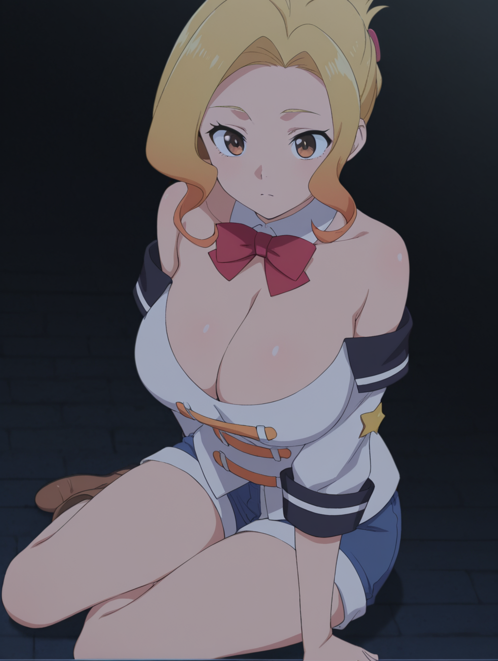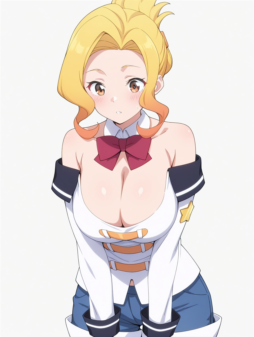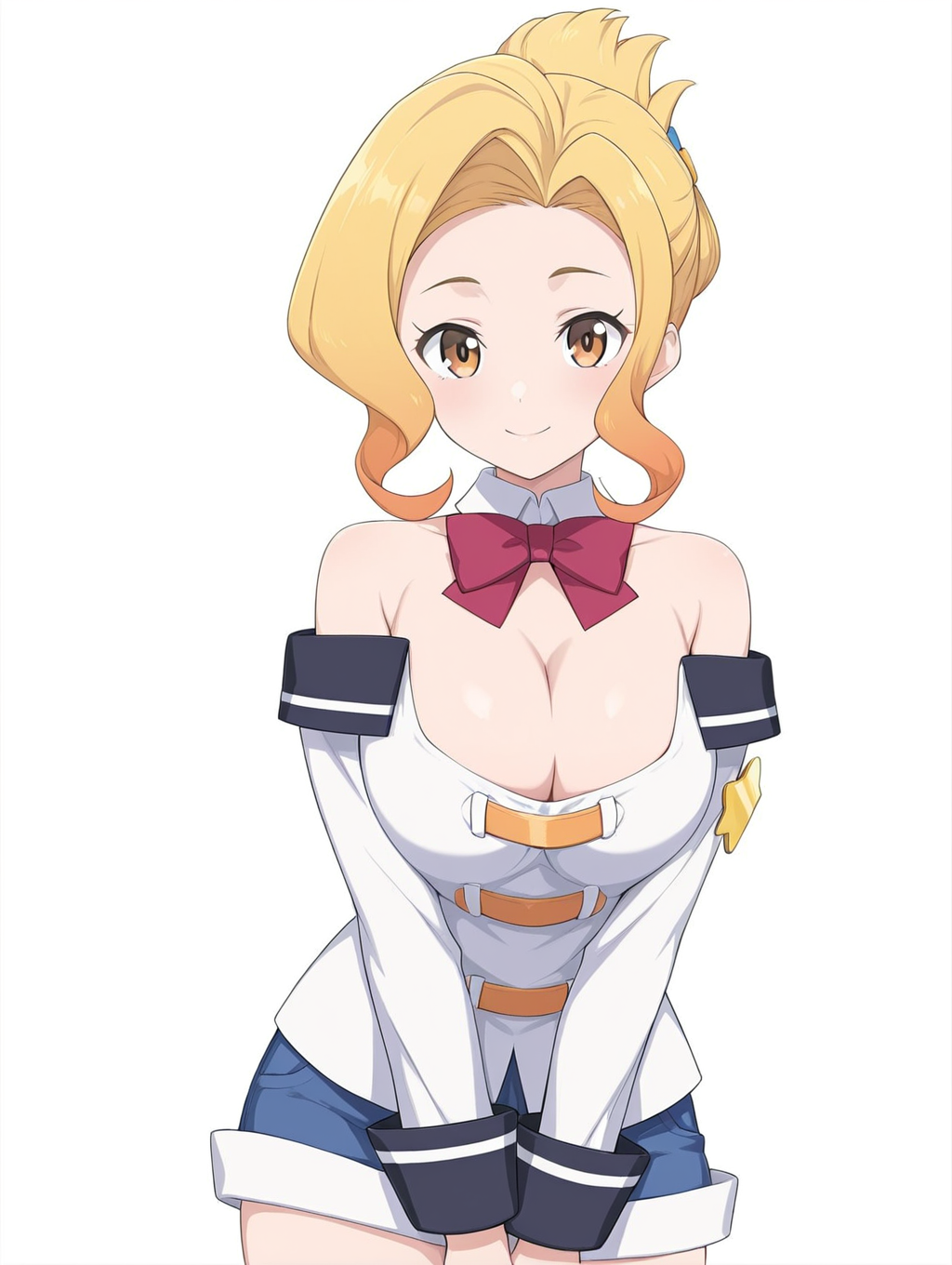Prompt: Luna-Liver020, 1girl, blonde hair, multicolored hair, brown eyes, short hair, large breasts,white shirt, short shorts, blue shorts, hair ornament, red bow, ornaments, bare shoulders, cleavage, detached collar