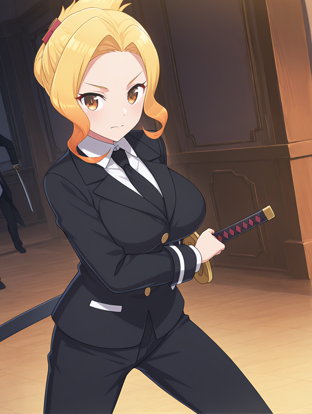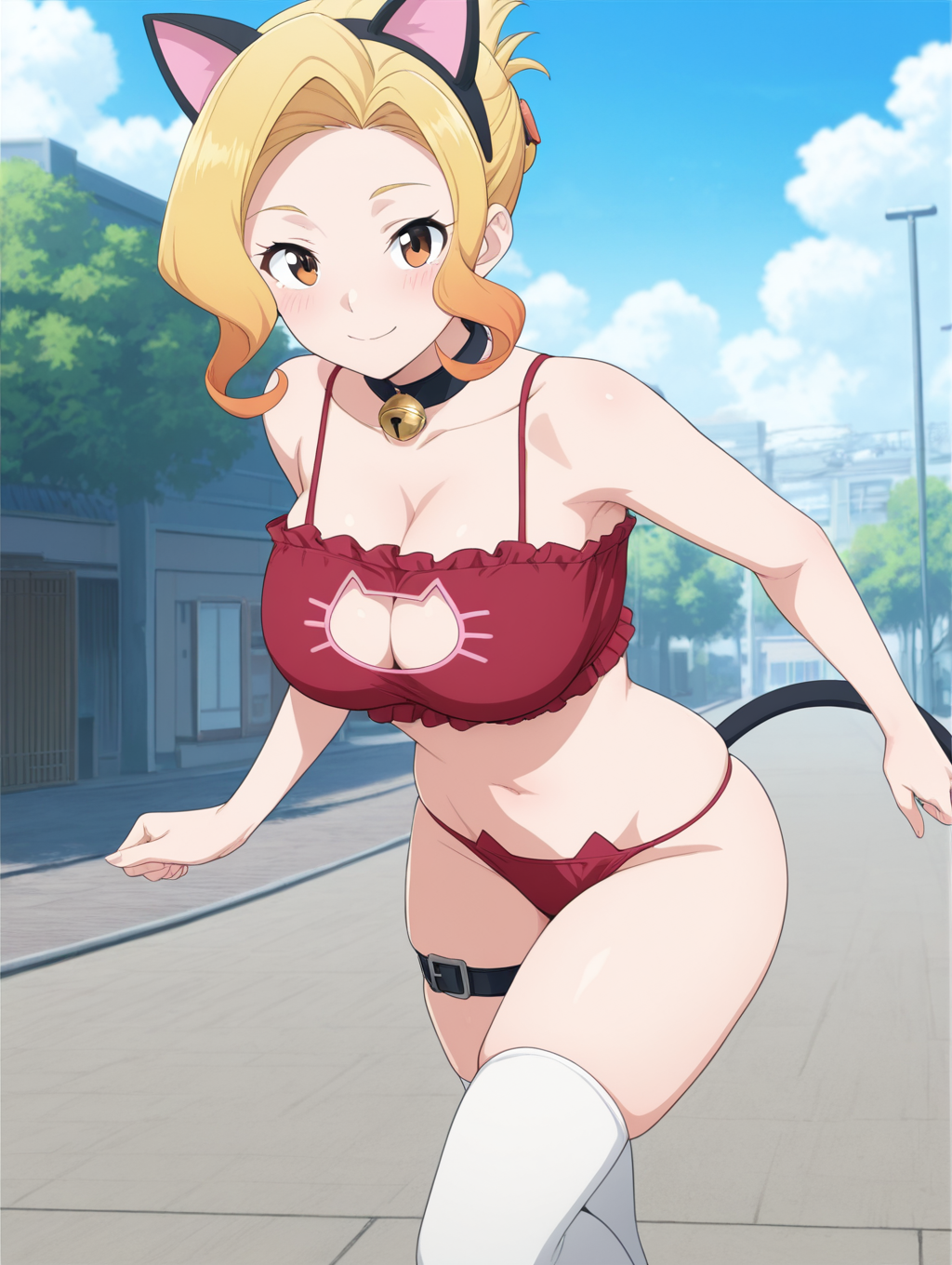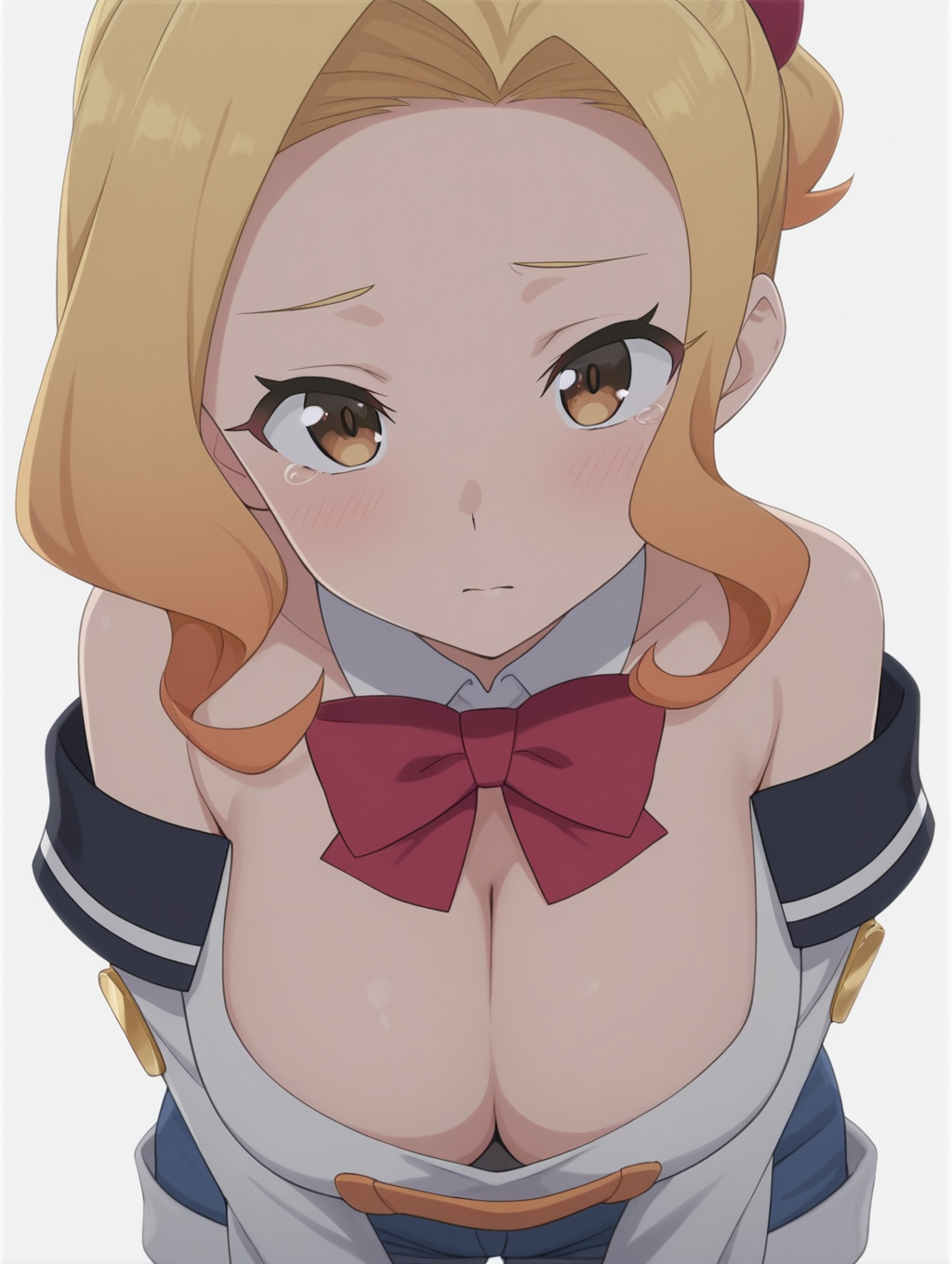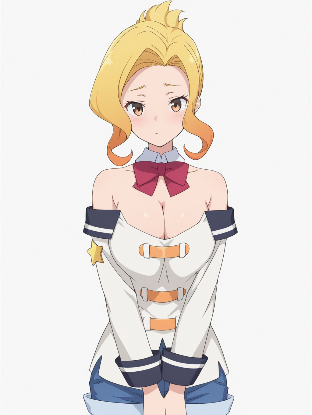 Prompt: Luna-Liver020, 1girl, blonde hair, multicolored hair, brown eyes, short hair, large breasts,white shirt, short shorts, blue shorts, hair ornament, red bow, ornaments, bare shoulders, cleavage, detached collar
