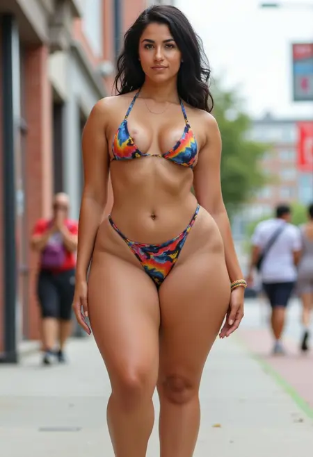 Describe the overall like: thin/slim fit, small breasts, and wide lower body,