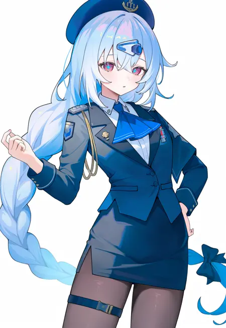 lanhaiqingcheng,hair ornament,hair bow,blue beret,blue ascot,white collared shirt,epaulettes,badge,black jacket,black pencil skirt,white gloves,thigh strap,black pantyhose,high heels