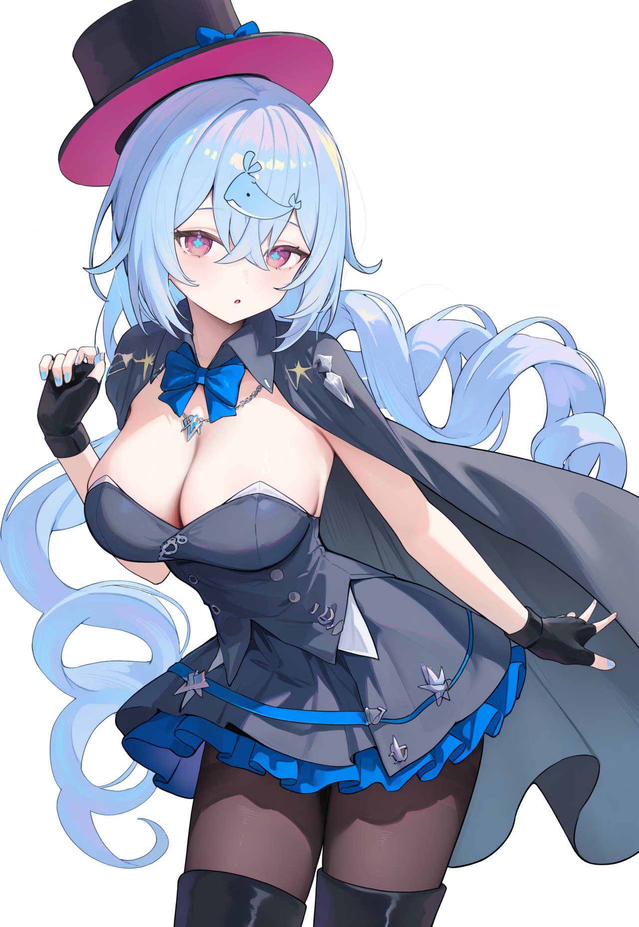 lanhaiqingori,top hat,hair bow,whale hair ornament,black cape,necklace,blue bowtie,black strapless dress,black fingerless gloves,blue nails,black pantyhose,thigh boots
