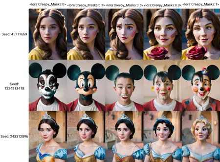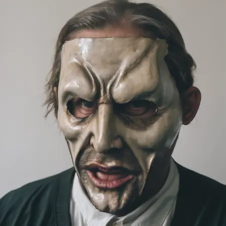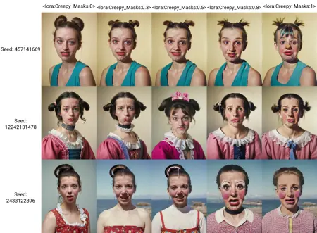 This model generates images of people wearing creepy masks. It's based on a dataset of low-cost, low-quality masks, both plastic and rubber. The results are both fun and eerie. Enjoy! 😆💜