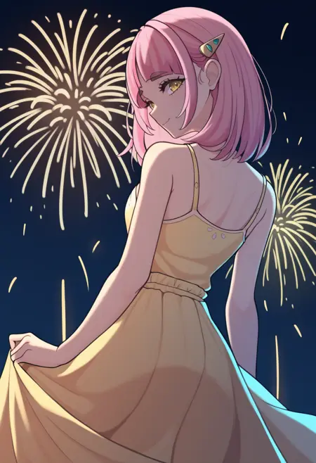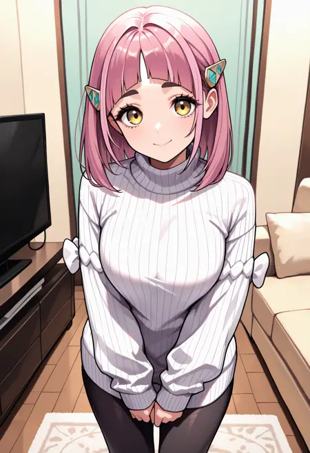 트리거 + 외모: l4c3y, 중간 길이 머리, 분홍색 머리, 곡선형 앞머리, 헤어클립, 노란색 눈, 속눈썹