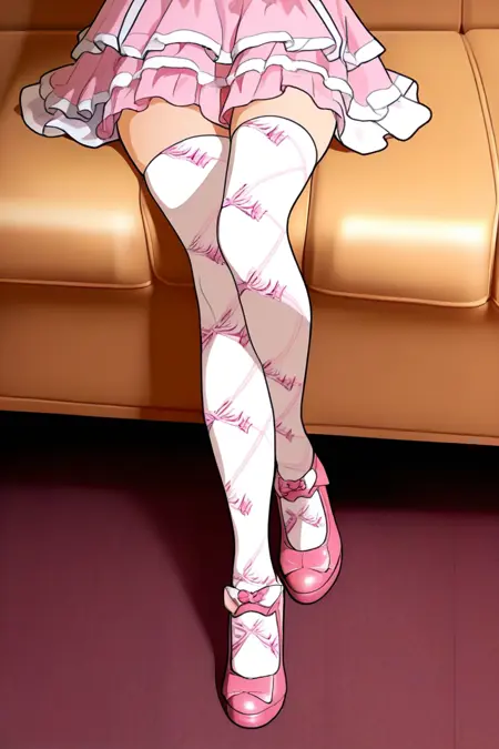 리본 패턴이 있는 허벅지까지 오는 양말입니다.