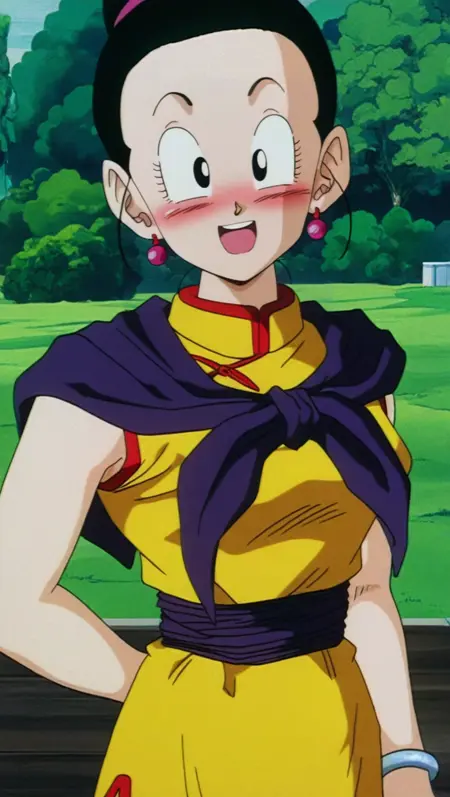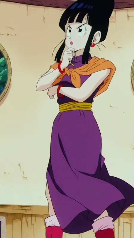 buu saga、髪を上げたスタイル、髪を結んだスタイル、片側の髪の結び目、黄色のチャイナドレス、紫のスカーフ、帯、紫の帯、ジュエリー、イヤリング、ブレスレット、ブーツ、黒い靴、中国風の服、