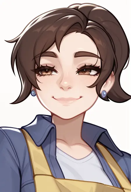服装:耳环,黄色围裙,蓝色夹克,有领夹克,白衬衫,棕色裤子