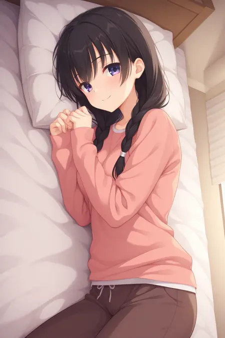 ddhazuki, 보라색 눈, 검정색 머리, 쌍둥이 땋은 머리, 흰색 스쿠닉, 어깨에 걸린 머리, 분홍색 셔츠, 긴 소매, 갈색 바지, 스웨트바지,