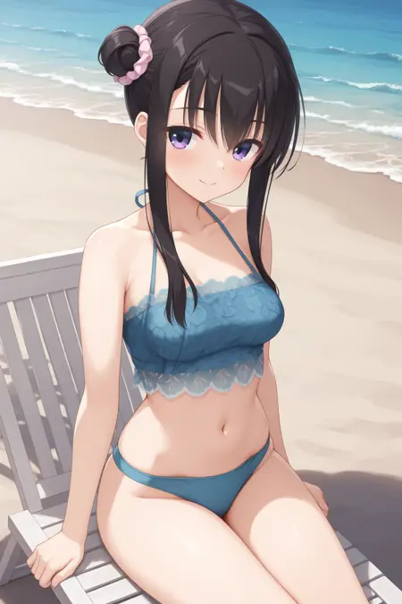 eehazuki, 보라색 눈, 검정색 머리, 한쪽 뾰족한 머리결, 분홍색 스쿠닉, 수영복, 파란색 비키니, 레이스 비키니, 홀터넥,
