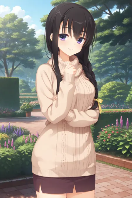 bbhazuki, 보라색 눈, 검정색 머리, 단일 땋은 머리, 노란색 헤어 리본, 어깨에 걸린 머리, 갈색 스웨터, 아란 스웨터, 터틀넥 스웨터, 손목을 넘는 소매, 갈색 스커트, 연필 스커트,